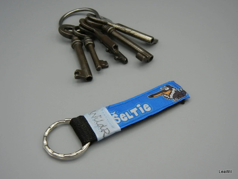 klíčenka z popruhu šíře 2cm a taftové stuhy s potikem, ozdobný klíčový kroužek