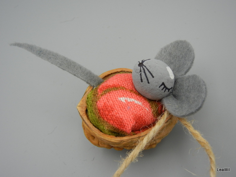 myška s peřinkou, hlavička z vatového tvaru, malovaná akrylovou barvou, dokreslená fixem, uši, ocásek z filcu