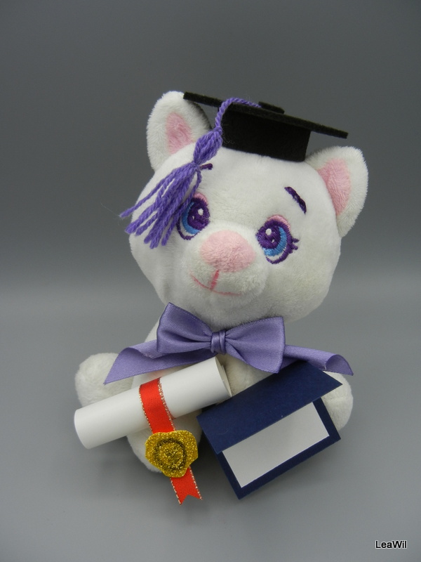 plyšák/dárek za promoci či maturitu, vysvědčení nebo důležitou zkoušku, každý plyšák má dělanou promoční čepičku na míru z filcu a střapec z příze, saténovou mašličku na krku, diplom z ozdobné stuhy s "pečetí", papír křídový, vyjímatelný z očka stuhy, lze na něj tedy napsat/nakreslit přání, gratulaci a pod. a zpět stočit a vložit