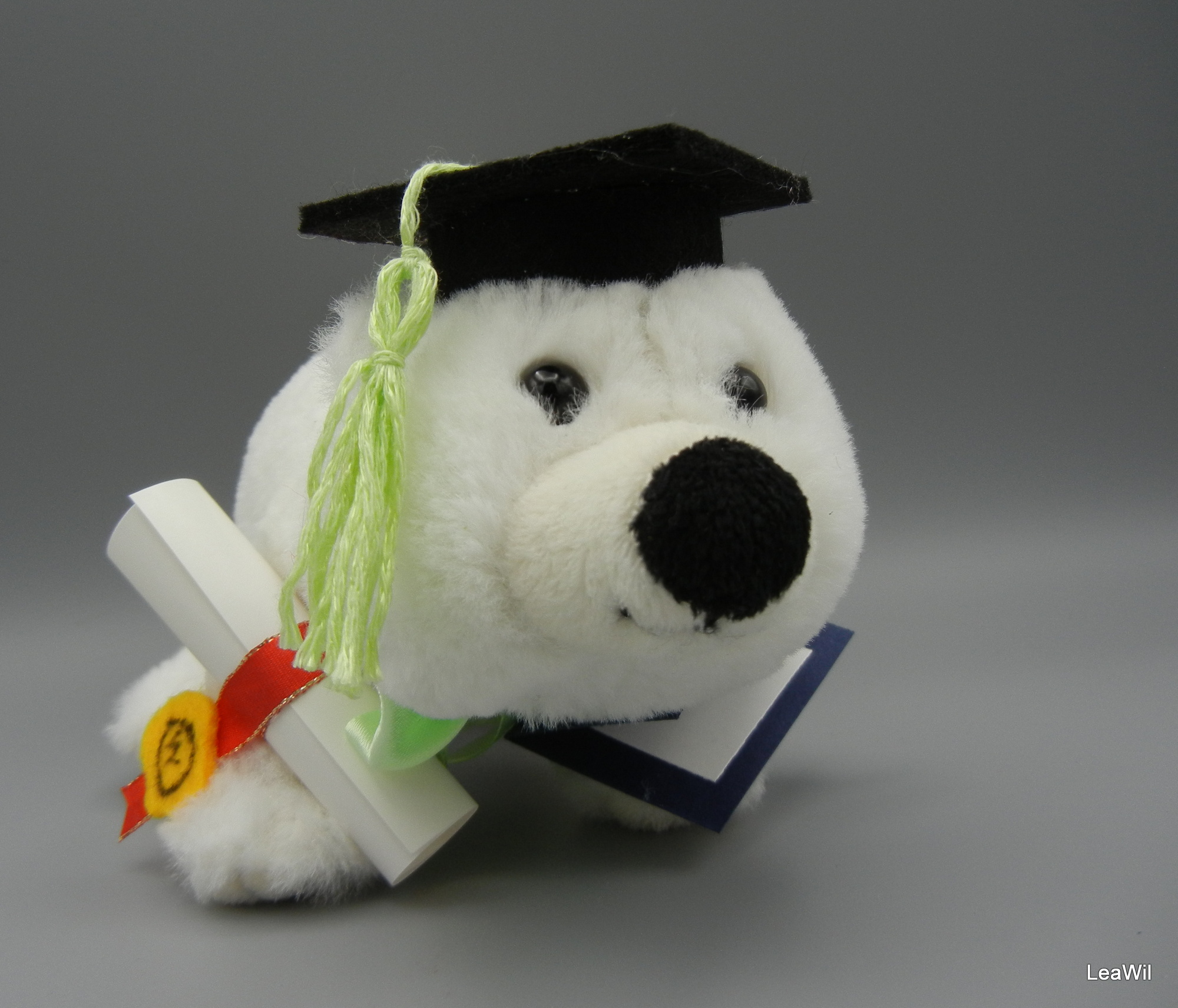 plyšák/dárek za promoci či maturitu, vysvědčení nebo důležitou zkoušku, každý plyšák má dělanou promoční čepičku na míru z filcu a střapec z příze, saténovou mašličku na krku, diplom z ozdobné stuhy s "pečetí", papír křídový, vyjímatelný z očka stuhy, lze na něj tedy napsat/nakreslit přání, gratulaci a pod. a zpět stočit a vložit