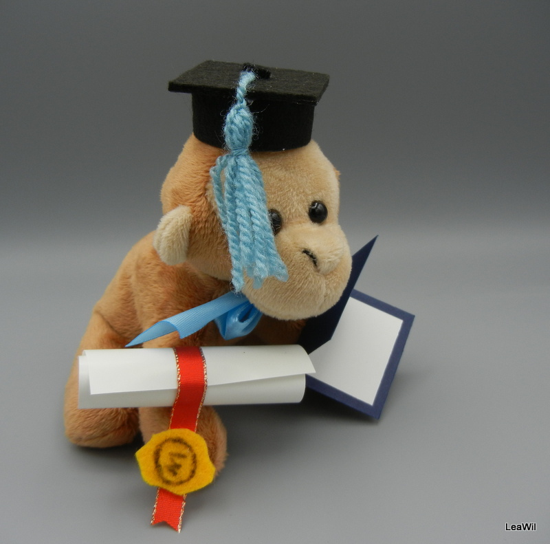 plyšák/dárek za promoci či maturitu, vysvědčení nebo důležitou zkoušku, každý plyšák má dělanou promoční čepičku na míru z filcu a střapec z vlny, saténovou mašličku na krku, diplom z ozdobné stuhy s "pečetí", papír křídový, vyjímatelný z očka stuhy, lze na něj tedy napsat/nakreslit přání, gratulaci a pod. a zpět stočit a vložit