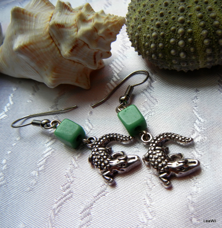 Naušnice z výlisku a sklěněného korálku ve tvaru krychličky, komponenty ve staro-stříbrné barvě. Naušnice budou dodány se silikonovou zarážkou.