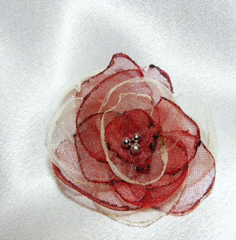 z organzového materiálu bordo a šampaň barvy, dozdobena stříbrnými korálky,průměr cca 5cm