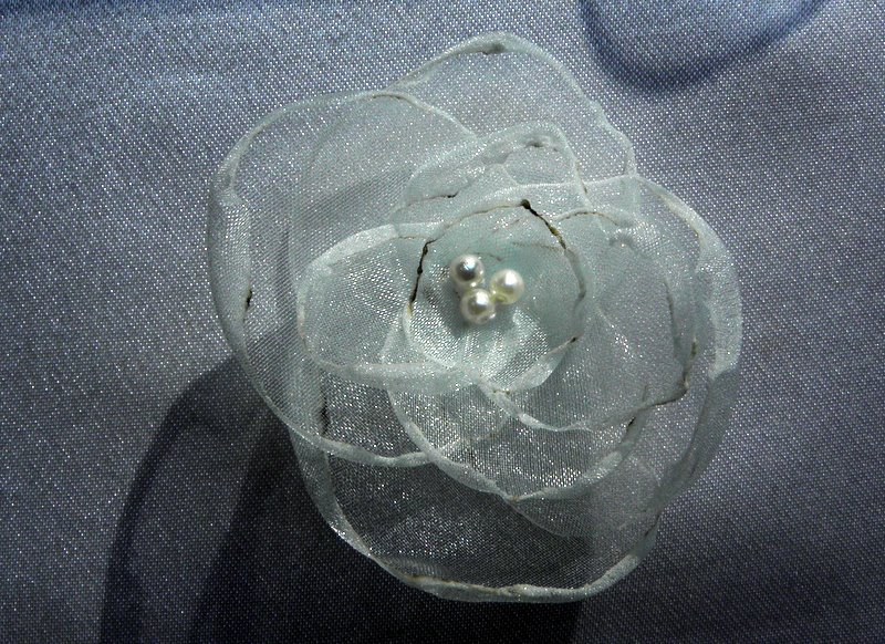 z organzového materiálu sv. modré barvy, s perličkami, průměr cca 6 cm
