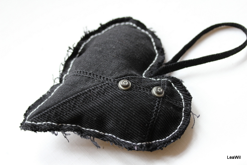 džínová dekorace s mnohaúčelným použitím - závěsná dekorace kamkoliv do bytu, na krytou verandu..., nevšední maxijehelníček, polštářek pod snubní prstýnky (lze uchytit např. na špendlíky a po svatbě použít jako upomínkovou dekoraci)