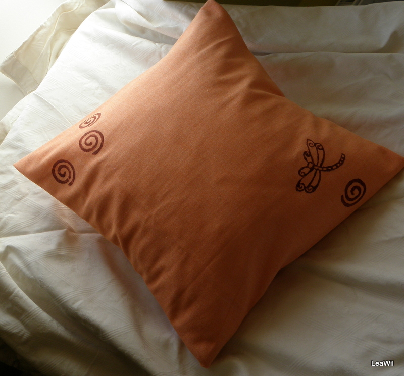 v jemně oranžové barvě s motivem spirálek a vážky (barva na textil) viz obrázky