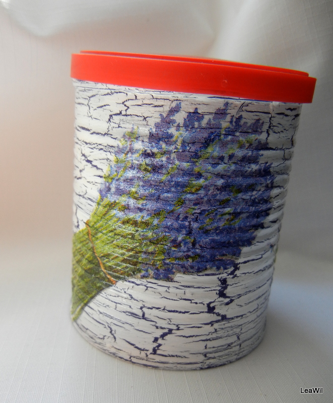 plechová krabička s plasovým víčkem, dozdobena akrylovými barvami, krakelováním a decoupage