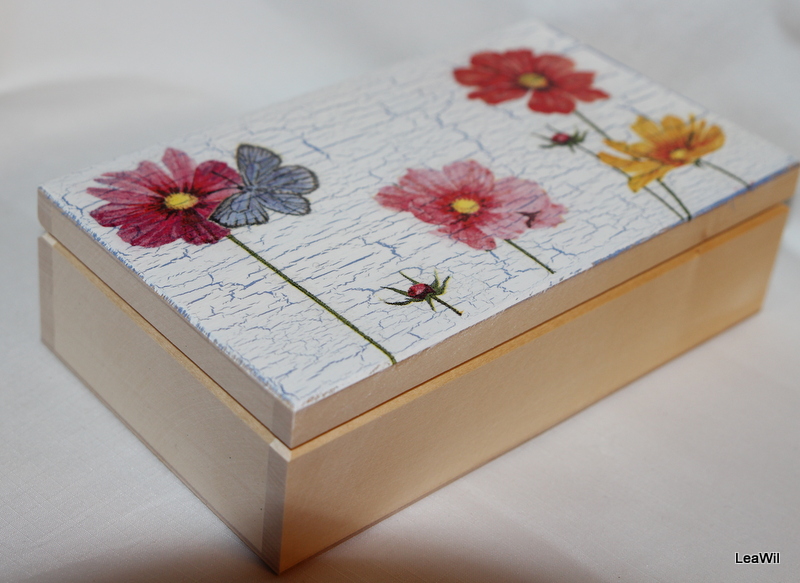 dřevěná šperkovnice na vše krásné či nezbytné natřena akrylovými barvami, zdobená krakelováním a decoupage technikou, vše přelakováno lakem.