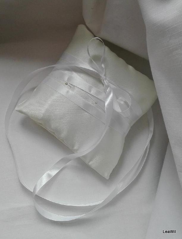 zdoben bílou saténovou stuhou, k úchytu možné špendlíky s perleťovou hlavičkou, nebo lze prstýnky navléknout na konce uvázané stuhy