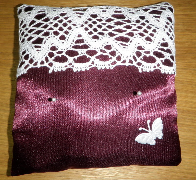 materiál - kvalitní bordo lesklý satén, špendlíky s perleťovou hlavičkou k úchytu prstýnků