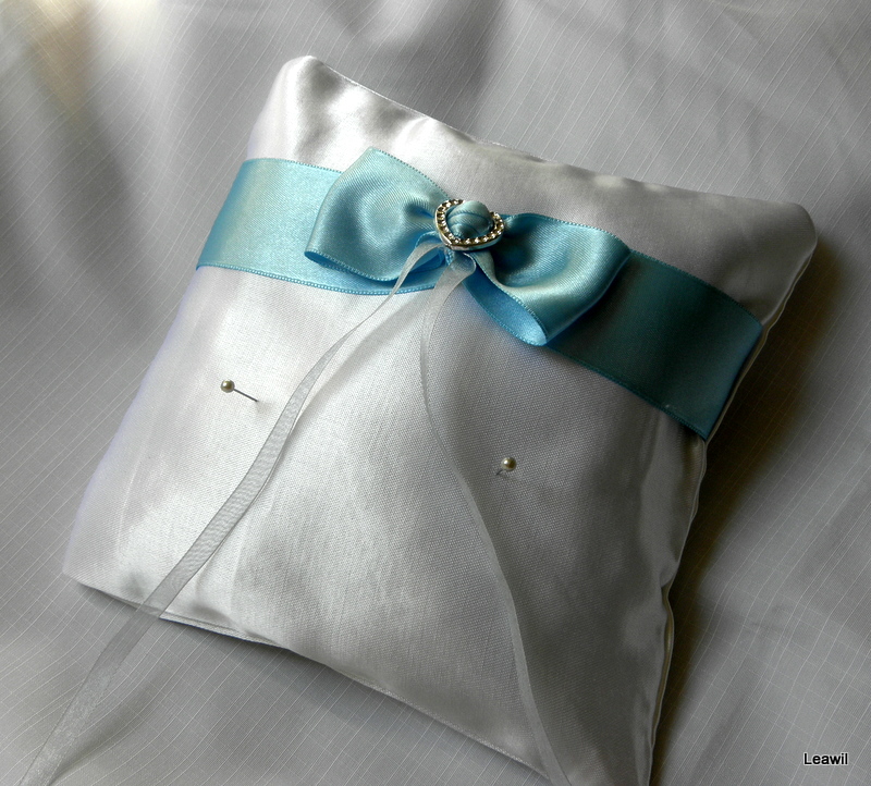 - Polštářek pod prstýnky s modrou stuhou a srdíčkem