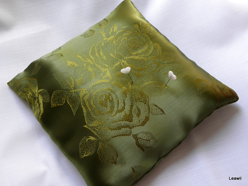 materiál - kvalitní zelená lesklá viskoza se vzorem zlatavých růží, špendlíky (k úchytu prstýnků)ve tvaru srdíček (bílé, či zelené na výběr)
