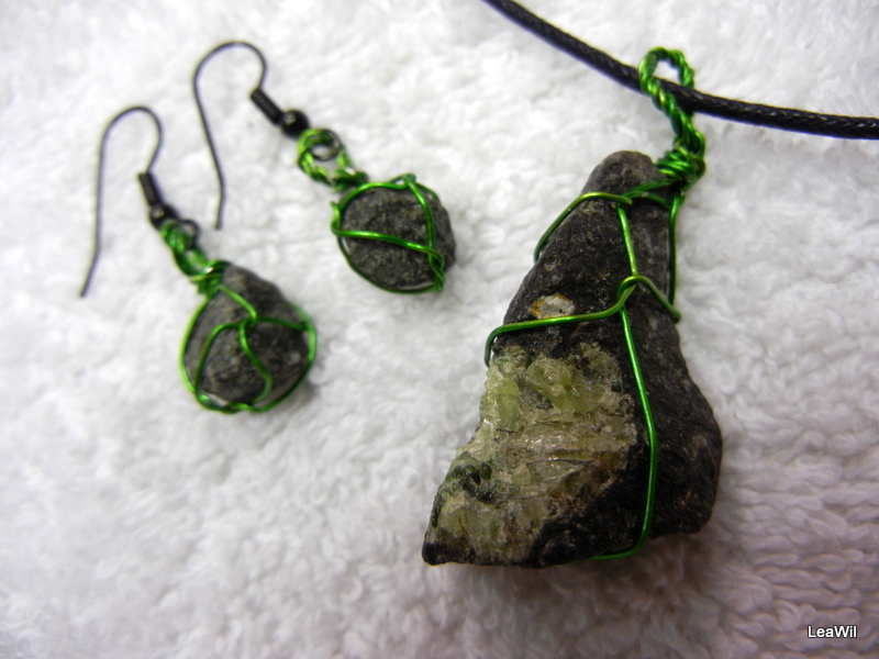 přívěšek délky 4cm z čedičového kamínku se zbytky olivínu, zelený drátek, zavěšeno na černé voskované šňůrce délky 45cm + 5cm prodlužovací řetízek zakončený zeleným korálkem