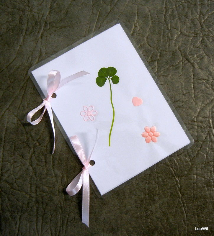 přání o rozměrech 15,5 x 11 cm s pravým čtyřlístkem, saténovými přízdobami, vnitřní část zdobená papírovými výseky, svázáno saténovou stužkou