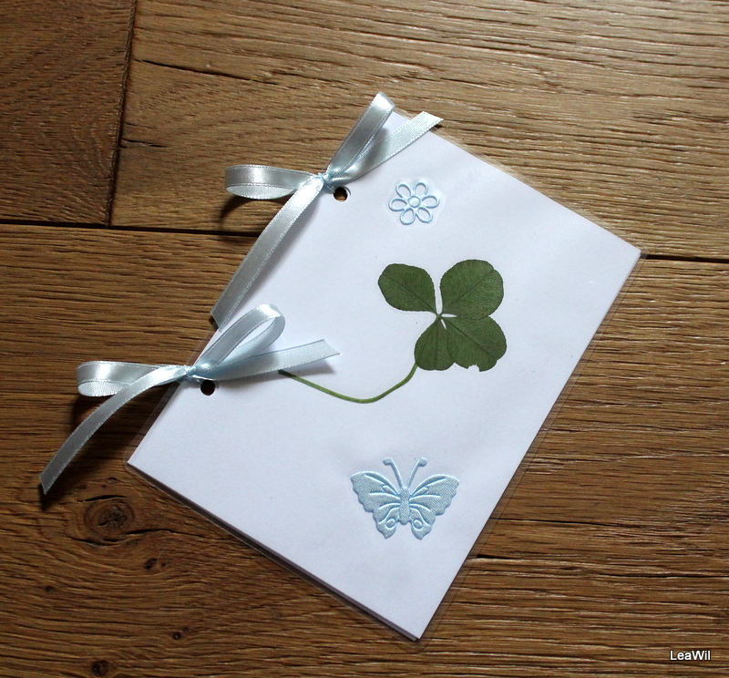 přání o rozměrech 15,5 x 11 cm s pravým čtyřlístkem, saténovými přízdobami, vnitřní část zdobená výřezy a papírovými výseky, svázáno saténovou stužkou