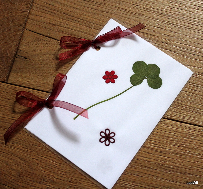 přání o rozměrech 15,5 x 11 cm s pravým čtyřlístkem, saténovými přízdobami, vnitřní část zdobená papírovými výseky, svázáno šifonovou stužkou