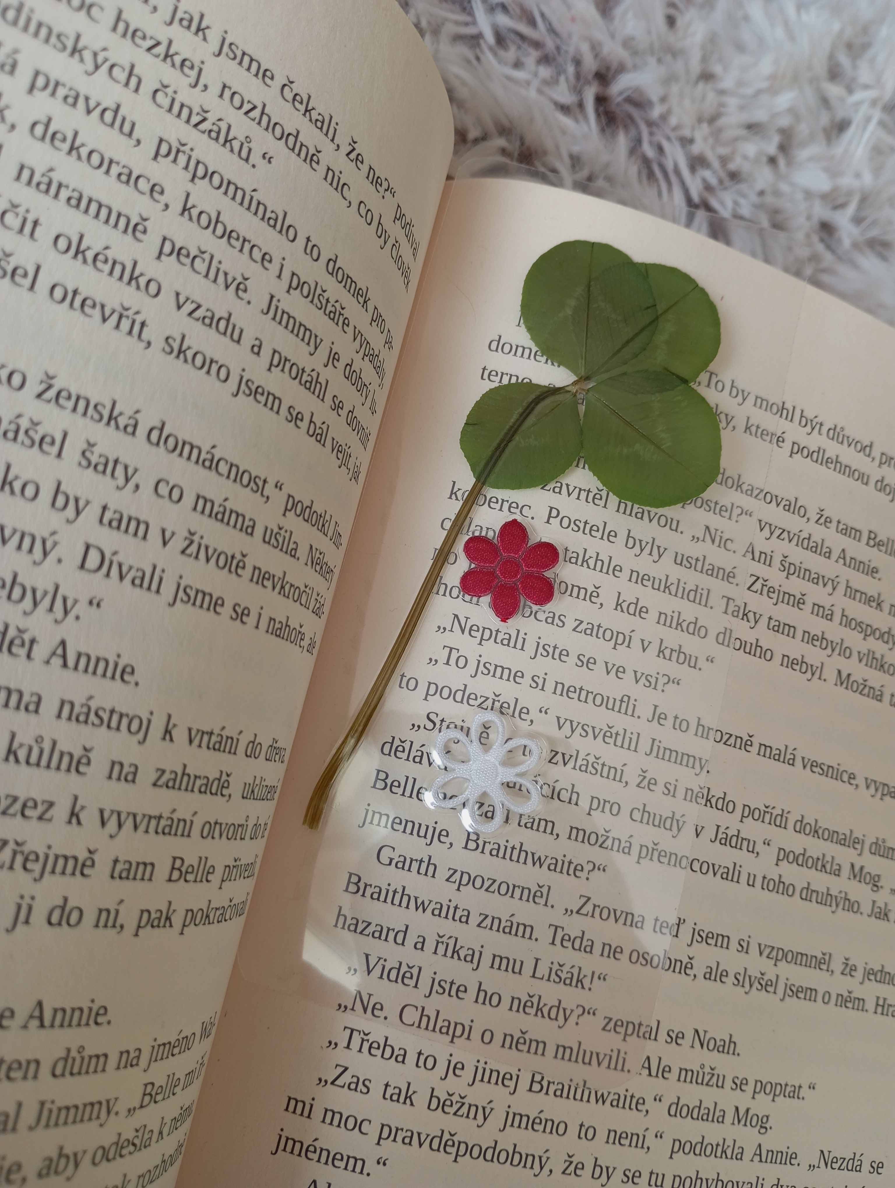 Záložka z pravého čtyřlístku a saténových přízdob