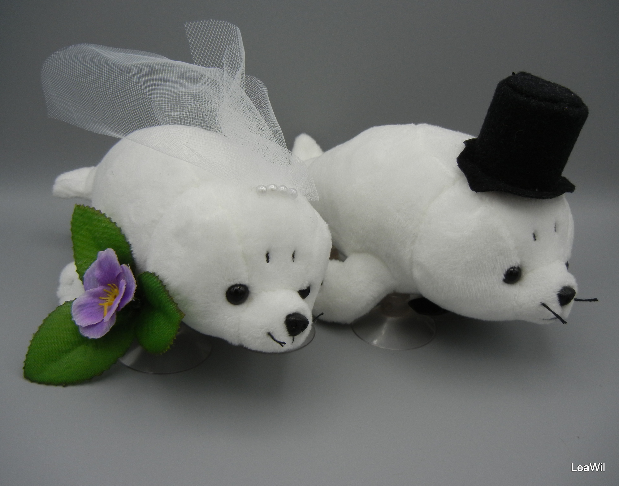 plyšáci jsou ručně dozdobeni tylovým závojem ozdobeným v úchytu perličkami, kytička je vyrobena z látkových lístků a přízdob , kompletně ručně šitý cylindr z filcu, vyztužený kartonem a šitý motýlek z taftové stuhy, +přísavky - na kapotě auta drží velmi dobře - doporučuji před uchycením kapotu dobře omýt (odmastit a zbavit prachu, aby přísavky dobře přilnuly)