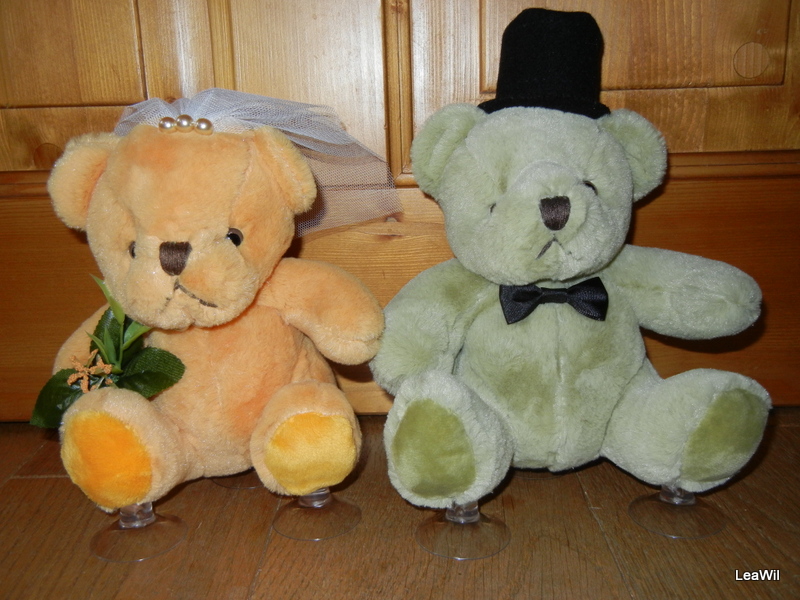 plyšáci jsou ručně dozdobeni tylovým závojem ozdobeným v úchytu perličkami (vše dobře přišité), přišitá kytička je vyrobena z látkovývh lístků a přízdob spojených tavnou pistolí, kompletně ručně šitý cylindr z filcu (velikost cylindru je vždy zvolena adekvátně každému plyšákovi na míru), vyztužený kartonem a šitý motýlek z taftové stuhy - vše přišito k plyšákovi, přísavky jsou také přišívané - na kapotě auta drží velmi dobře - doporučuji před uchycením kapotu dobře omýt (odmastit a zbavit prachu, aby přísavky dobře přilnuly)