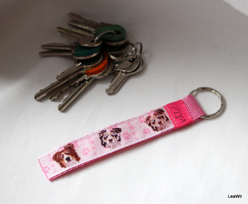klíčenka z popruhu šíře 2cm a taftové stuhy s potikem, ozdobný klíčový kroužek