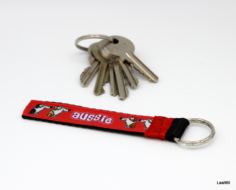 klíčenka z popruhu šíře 2cm a taftové stuhy s potiskem, ozdobný klíčový kroužek